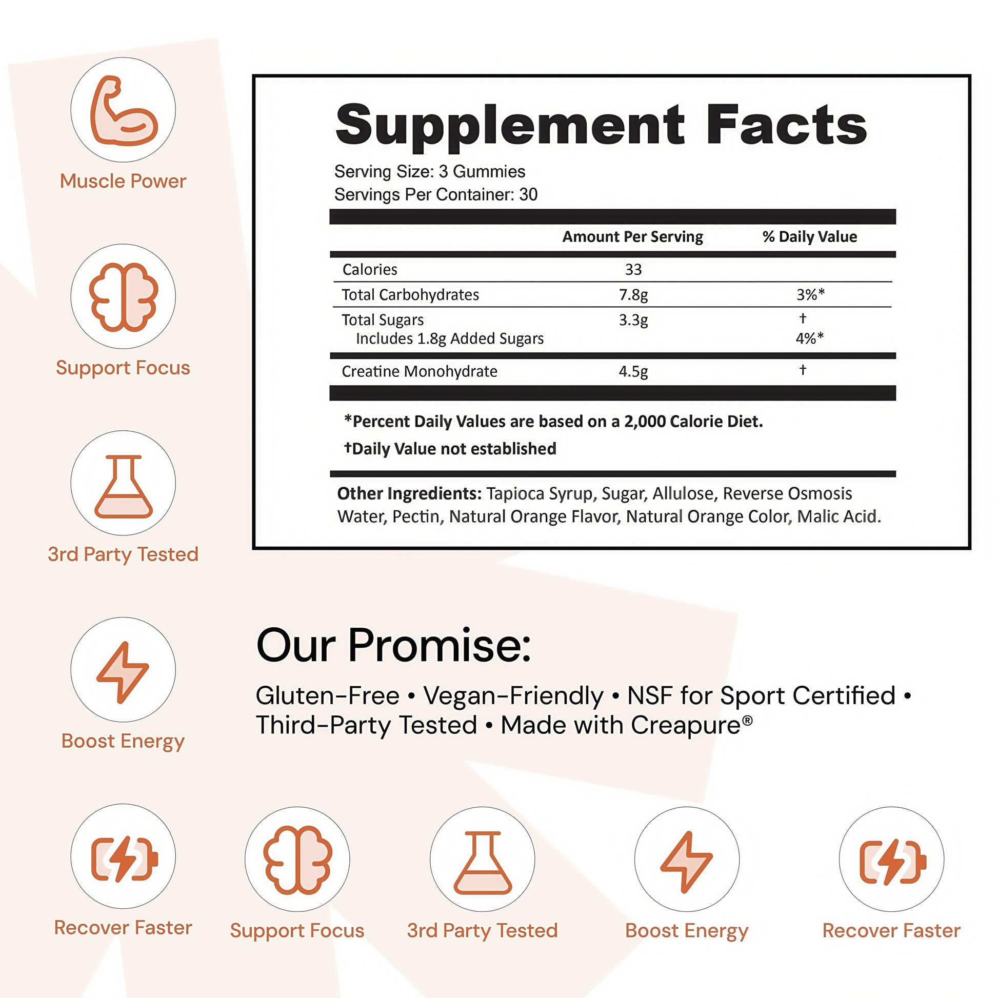 Core Gummies - Orange: Creatine Monohydrate, Tapioca Syrup, Sugar, Allulose, Reverse Osmosis Water, Pectin, Natural Orange Flavor, Natural Orange Color, Malic Acid